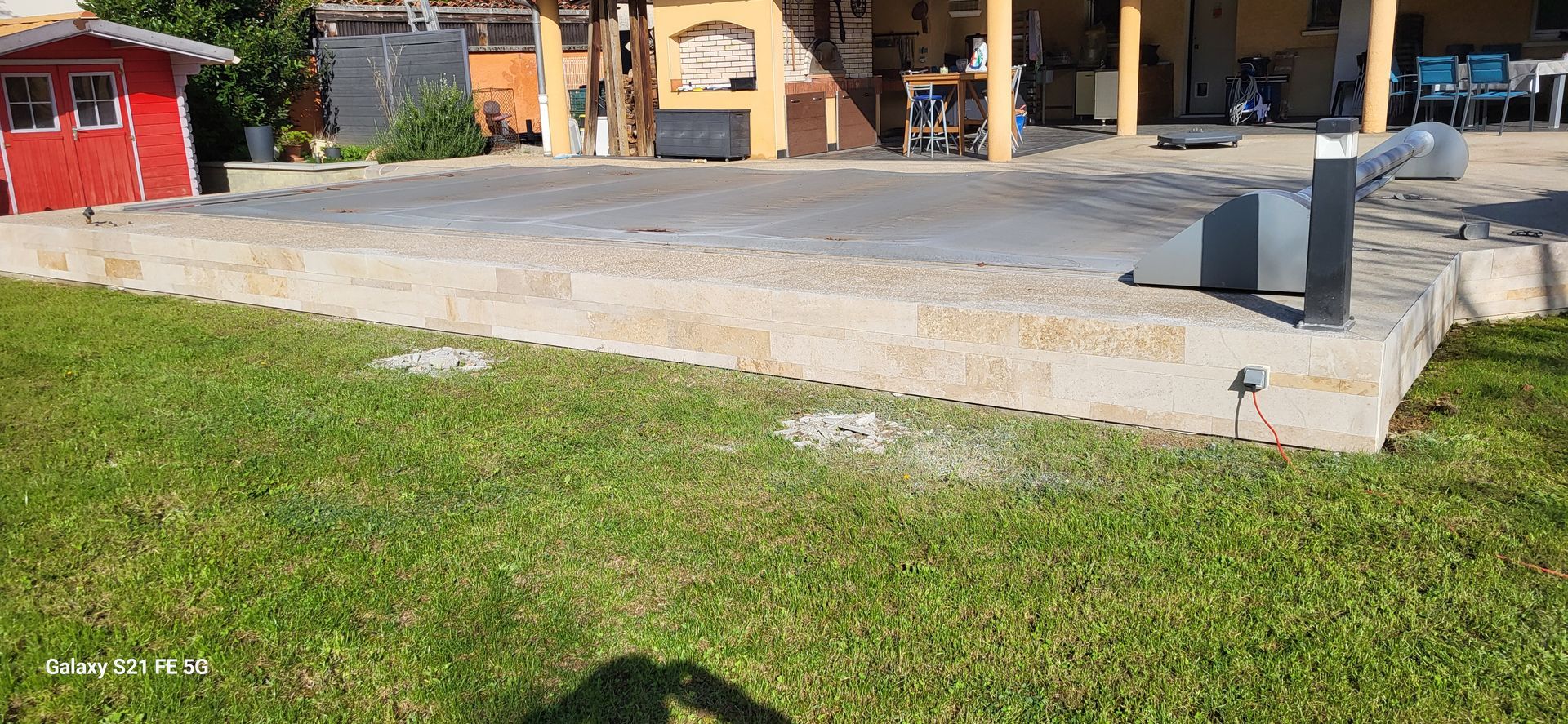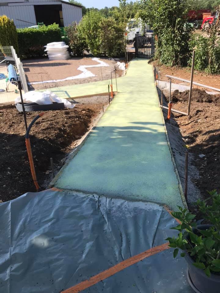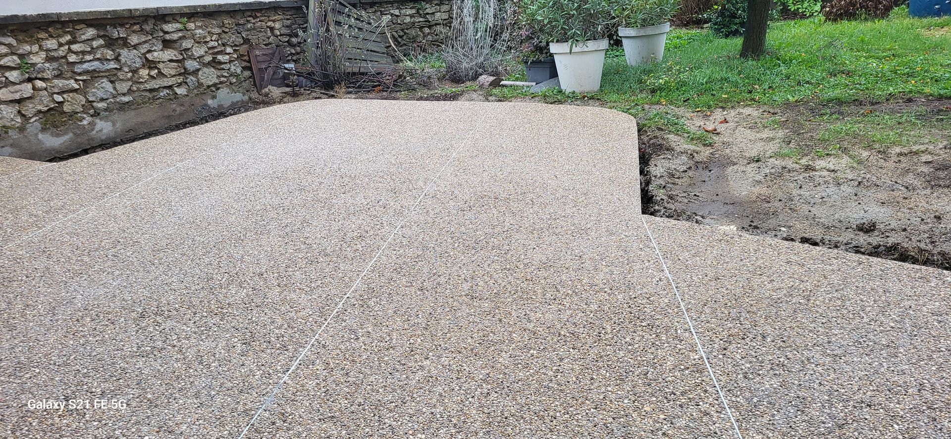 Plage autour d'une piscine en béton poncé effet non glissant la couleur du cailloux est au choix du client.